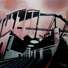 Bij deze presenteer ik mijn laatste schilderij uit de serie Brave New World, ‘Mind The Gap’. Dit is het jaar dat ik 50 ben geworden (24-08-70). Ik heb de traditie dat ik eens in de zoveel tijd een zelfportret maak. Meestal naar aanleiding van een sleutelmoment. 50 is zo’n sleutel moment. Wat je hier ziet is mijn veel jongere zelf in een schommel, Ik was± 3,5 jaar oud. Ik houdt de halsband van onze boxer Vesta goed vast. Ik sluit niet uit dat mijn ouders dit zo geënsceneerd hebben. Maar ik nam mijn taak serieus, dat kan je zien aan mijn vastberaden blik. Wij woonden toen nog in Scharwoude (Noord Holland).
